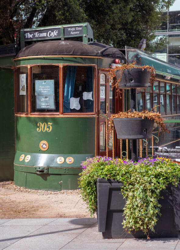 Построенный в 1902 году в Филадельфии, большую часть своей трамвайной жизни он провел в Португалии. Некоторое время выставлялся в музее в Колвин Бэй, Уэльс, а затем был продан и каким-то образом оказался в полях в Муллахе, графство Каван, где его обнаружил местный бизнесмен. И у трамвая началась новая жизнь. Его восстановили, красиво осветили. Он по-прежнему служит людям, но теперь на постоянном приколе. Маленький и уютный, он предлагает разнообразное меню в причудливом и ностальгическом интерьере.