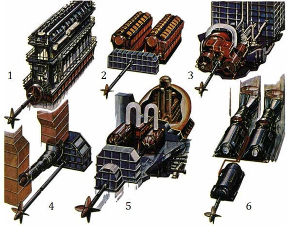 1 низкооборотный дизель, непосредственно работающий на гребной винт; 2 дизель-редукторная установка; 3 паротурбинная установка; 4 газовая турбина; 5 атомная установка; 6 газотурбинная установка с электрической передачей на винт.