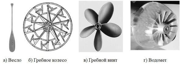 Воду для «опоры» используют следующие движители: весло, гребное колесо и гребной винт, водомет, реактивная струя (рис. 13.11).
