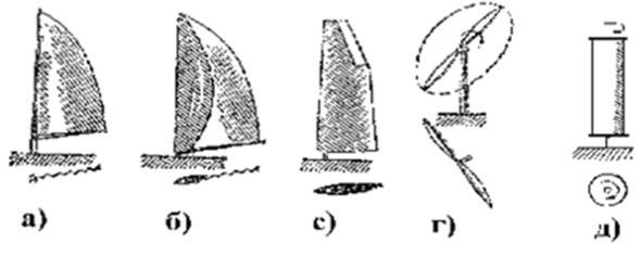 а мягкие паруса; б полужесткие паруса; в жесткие паруса-крылья; г авторотирующий пропеллер; д вращающийся ротор, работа этого ротора основана на эффекте Магнуса