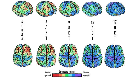Первыми созревают задние отделы головного мозга: мозжечок, отвечающий за двигательные функции, затылочные доли, отвечающие за зрение и т. д. Лобные доли, играющие ключевую роль в регуляции и контроле деятельности, формировании высших когнитивных функций, созревают в последнюю очередь.