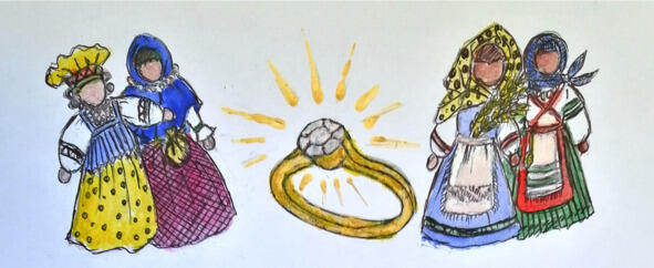 Отправился на следующий день Ванюшка искать себе невесту. Где только не хаживал, везде предлагал той, которая понравилась ему, примерить колечко. Только никому оно не подходило. То мало, то велико, так и не нашёл себе невесту Ванюшка, а вернулся домой ни с чем.
