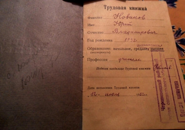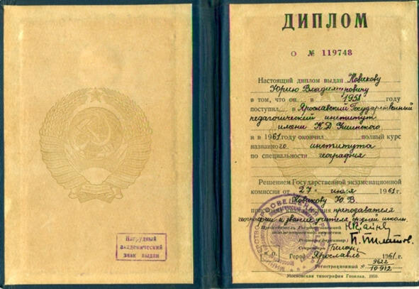 С младых лет родители приучили его к труду (дома в то время, как и в домах других жителей, держали многочисленную живность). Имея исключительный музыкальный слух, он рано научился играть на музыкальных инструментах. Особенно ему нравилось играть на гармошке. Да и было в кого: отец учился в Костромской духовной семинарии и имел уникальный голос, в церковном хоре пробовал партии баса, основным голосом был баритон, не брезговал тенором и иногда брал ноты дисканта даже в значительном возрасте, а дед его, священник погоста Рождества Богородицы Александр Алексеевич Новиков, тоже студент Костромской духовной семинарии в прошлом, имел бас-баритон и был в окормляемых им церковно-приходской школе села Скоробогатово и двухклассном училище села Завражье законоучителем и преподавателем пения. По окончании Солтановской школы Юрий Владимирович поступил в сельскохозяйственный техникум на агронома плодоовощевода. Получив образование и поработав совсем немного в колхозе по специальности, попробовал свои силы в поступлении в Ярославский медицинский институт. Его знания химии приёмную комиссию в полной мере не удовлетворили, и Юрий поступил в Галичский учительский институт на естественно-географический факультет. По окончании института начал работать учителем естественно-научных дисциплин в Нижне-Нейской школе.