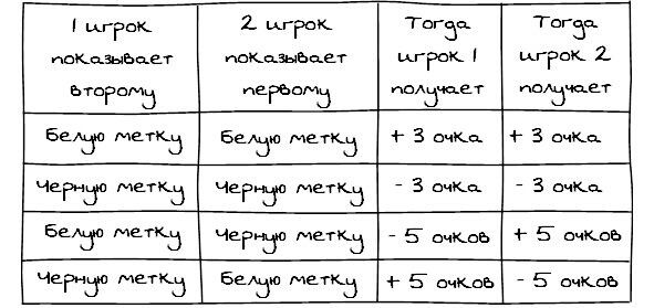Разобравшись с этой таблицей, участники узнают от ведущего, что игра длится, допустим, 5 ходов. Видимо, показывать черную метку уже в первом ходу не стоит. Ведь тогда отношения испортятся с самого начала, и от этого игрока ничего, кроме потерь, ожидать не придется. Значит, на первом ходу имеет смысл быть «добрым» и показывать белую метку. И так делать до самого или почти до самого конца, ведь поддержание хороших отношений позволит стабильно получать по 3 очка и ничего не терять от рискованной игры. А если поставить черную метку, уже буквально на следующем ходу оппонент ударит в ответ, и больше заработать с ним/на нем не получится.