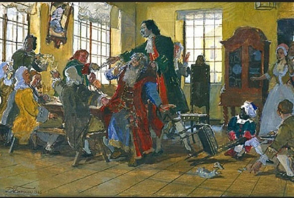 Царь Пётр стрижёт бороды боярам. Худ. Д. Билюкин