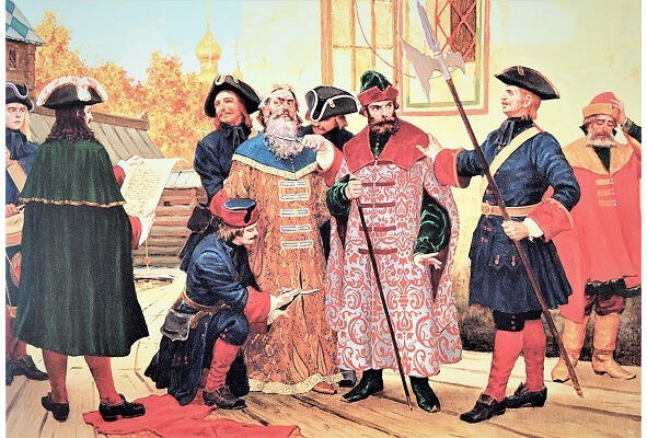 Хотя указ «Бороду брить» Пётр издал накануне, 5 сентября (29 августа) 1698 года, всё равно трудно представить ужас и унижение царских гостей в те зимние дни! (По следующему указу 1705 года купцы первой гильдии должны были платить за право носить бороду 100 рублей, бояре, служилые люди, купцы второй гильдии по 60 рублей, а посадские 30 рублей! А в то время за один рубль можно было купить 420 килограмм ржаного зерна! Поэтому многие обрезанную бороду носили под рубахой на груди и просили положить её с собой в гроб после смерти, прим автора).