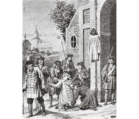 Но не унимался пьяный царь, и оскорбления продолжались. Он стаскивал с бояр русскую одежду, обнажая их тела, что равносильно было страшному бесчестью мужчины и всего рода, и начинал кромсать традиционно длинные подолы и рукава кафтанов. (В январе 1700 года царь узаконит свои бесчинства именным указом, по которому с пеших людей, одетых в русский костюм, на въездных воротах в каждый город брали плату 40 копеек, а с всадника 2 рубля! прим. автора).