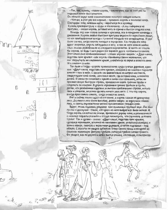 Лошадь под ним стояла сильная и красивая, вся в ожидании команды к движению. Король любил быстрые прогулки верхом по окрестным лесам, но его приближенные всегда с тревогой ожидали его возвращения. И уже были случаи, когда король попадал в переделки. Как-то раз на прогулке его конь вдруг захромал, король заблудился в лесу, и попал в засаду, устроенную бог весть откуда взявшимися разбойниками из соседнего королевства. И ничто не спасло бы короля, не будь с ним рядом его верного друга охотничьего сокола.