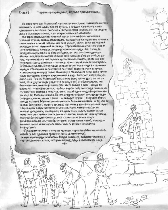 Маленький папа стоял на лестнице, скрестив руки на груди, и смотрел прямо перед собой. Поначалу у Маленького папы было точно такое ощущение, которое, наверно, имел в виду Хотпехот, когда рассуждал о снах. То есть Маленький папа точно знал, кто он здесь такой, он знал, что и другие люди рядом это знают, и все, что было вокруг, ему было известно, но в то же время (так часто бывает в снах какую бы жизнь мы не проживали там, в этих сновидениях, глубоко внутри себя мы всегда помним, кто мы такие) он тихонько понимал, что стоящий здесь гордый король это все еще он, Маленький папа.