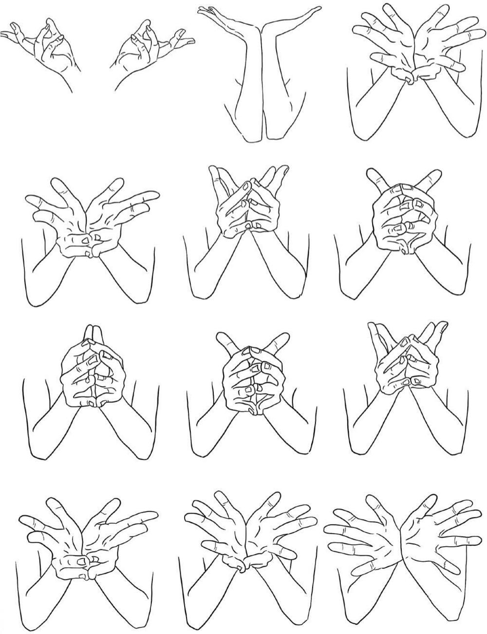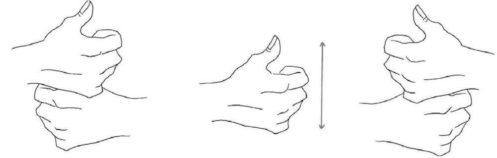 Пальцы правой руки расставлены широко («солнышко»), пальцы повернуты в сторону, ладонь повернута к себе.