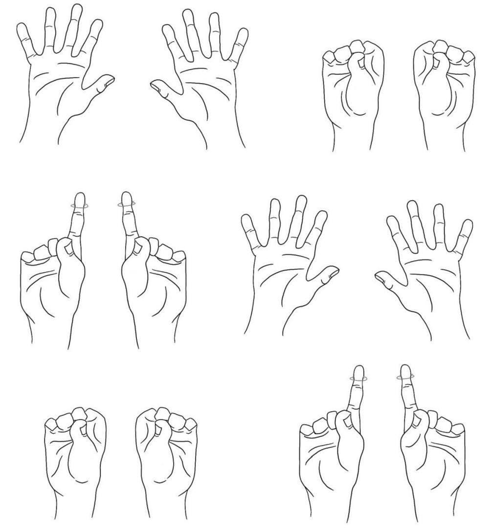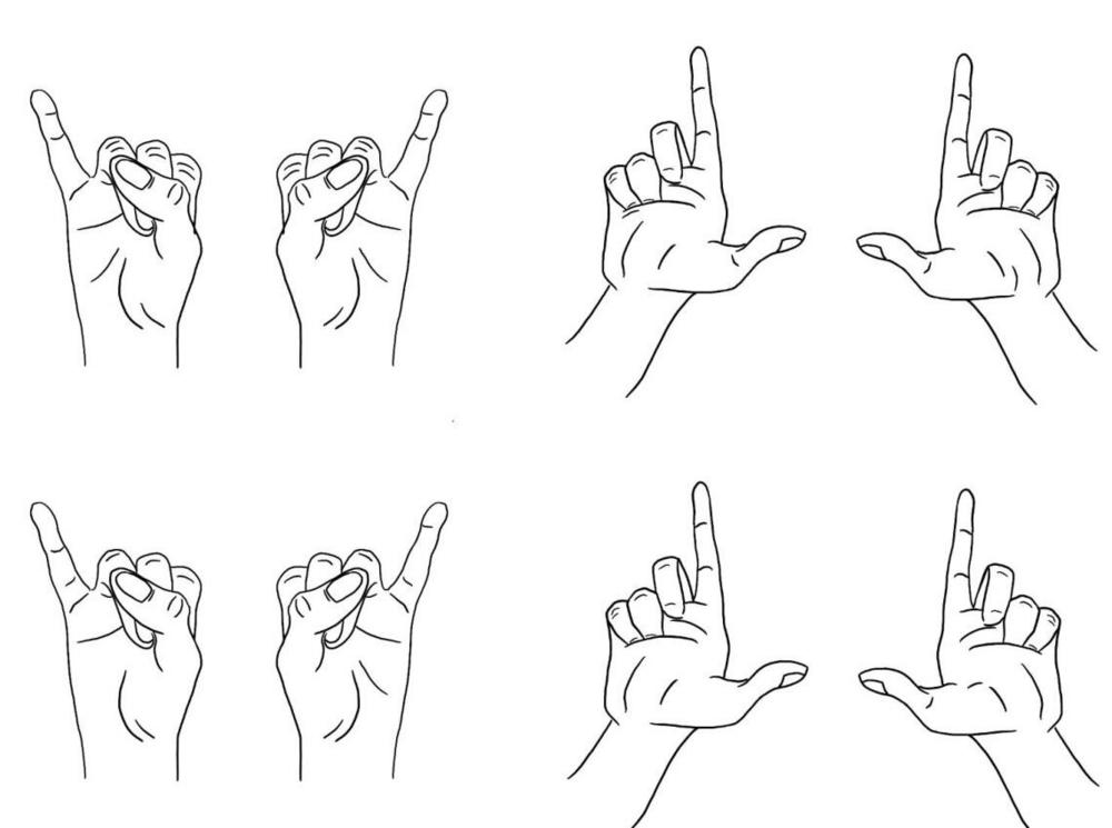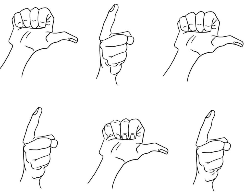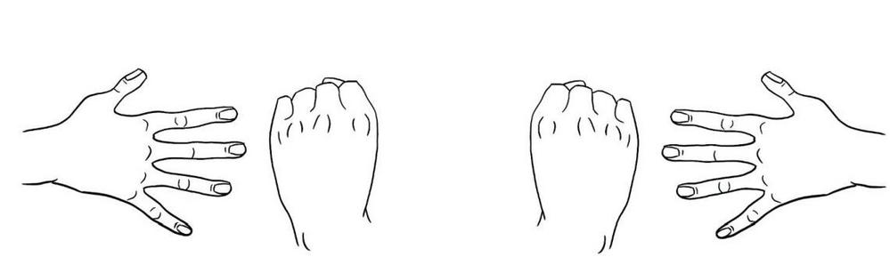 Выполняем сначала правой рукой: пальцы зажаты в кулак, большой палец в сторону это поза 1. Поза 2 пальцы зажаты в кулак, указательный наверх. И смена поз 1 и 2.