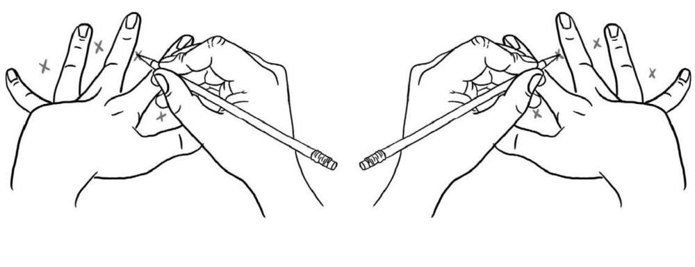 Возьмите карандаш или ручку в одну руку. Пальца другой руки широко расставлены и лежат на столе, ладонью вниз.