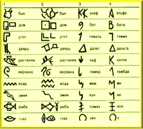 Здесь показана этапность преобразований (1) древнеегипетских иероглифов и понятий в (2) промежуточное видоизмененное египетское иероглифическое письмо, применяемое различными народами на Синайском п-ове и Ханаане вплоть до 1200 г.г. до н. э. (протосинайское письмо). И далее, возникновение (3) финикийских букв, на основе которых произошел (4) греческий алфавит. Названия греческих букв это преимущественно финикийские слова. Греческий историк Геродот писал, что древние греки научились письму от финикийцев.