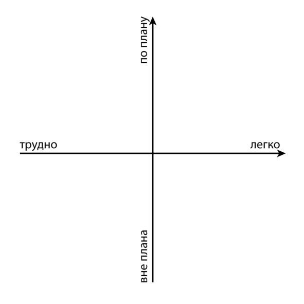 Вначале рисуем сам Квадрант: строим две системы координат, по оси абсцисс (горизонтальная линия) откладываем ТРУДНО (слева) ЛЕГКО (справа), по оси ординат (вертикальная линия): ВНЕ ПЛАНА (внизу) ПО ПЛАНУ (вверху).