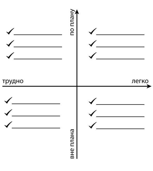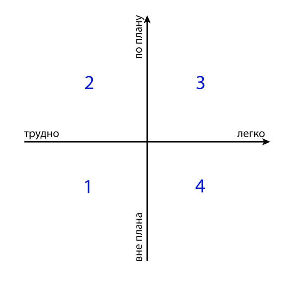1. Нет единого критерия ни в «планово вне плана», ни в «трудно легко». В «планово» может попасть и то, к чему вы готовились десятилетие, и то, что решили накануне. Также нет критерия того, что для вас трудно и легко: внешне сложные события могут вам даться совсем легко, и наоборот.