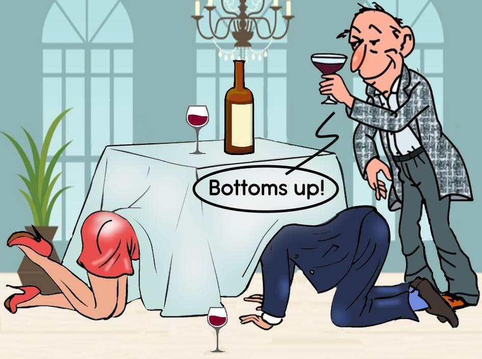 Они должны были опустошить свои бокалы и больше ничего. Bottoms up! соответствует русскому «пей до дна!» Здесь обыгрываются два значения многозначного слова bottom: у стакана это дно, а у человека мягкое место пониже спины.
