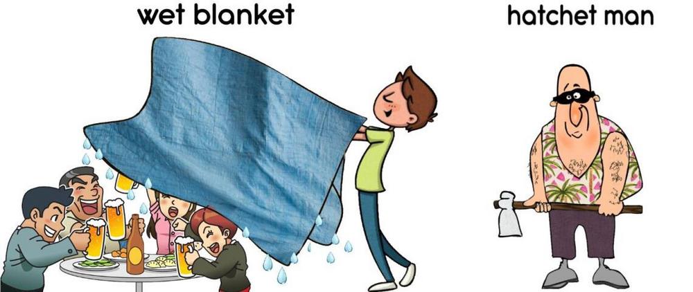 a wet blanket; a stuffed shirt; a hatchet man; a stick-in-the mud; a joker in the pack