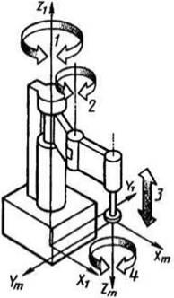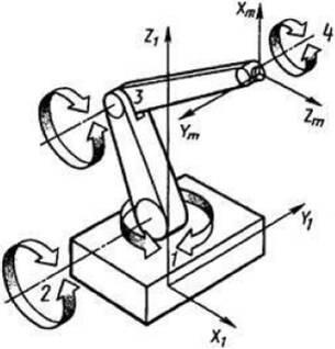 4.Робот с ангулярной (угловой) системой координатных перемещений и сферической системой координат, схема которого представлена па рис. 1.4, имеет три вращательные подвижные кинематические пары, обеспечивающие степени подвижности.