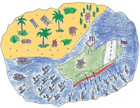 Бамбуковые копья и стрелы сторонников Рихти Пана легко пробивали ветхую броню «адмирала Кузнецова», но застревали в его корпусе. Исчерпав таким образом весь запас своего стратегического вооружения, защитники Кох Туть вынуждены были сдаться на милость врага. Конг Сом Оэн был беспощаден и жестокосерден. Высадившись со своей командой на берег, он спалил деревню напалмом, вырезав всех ее жителей, кроме детей ниже мотоциклетного колеса. Хитроумный мерзавец Рихти Пан избежал казни: покинув перед самым сражением Кох Туть с небольшим отрядом под покровом ночи, он вероломно напал на Буд Дудь родную деревню Конг Сом Оэна и похитил Антонину.