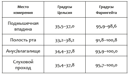 В домашних, бытовых условиях используется измерение температуры тела, в том числе и для детей с первого дня жизни, в подмышечной впадине. Это место считается оптимальным, поскольку физиологические изменения температуры тела в этой области, а значит, и погрешность минимальны. В зарубежных фильмах можно увидеть, что в других странах практикуется измерение температуры в ротовой полости. Ветеринары чаще всего измеряют температуру своим пациентам ректально. У обоих способов есть технические и этические ограничения. А главное, локальное воспаление ротоглотки[1] или органов малого таза может давать значительную погрешность. Например, в гинекологии активно используется сравнение температуры ректальной (либо измерение во влагалище) и в подмышечной впадине для диагностики воспаления. Показатели, которые считаются нормальными, также отличаются на разных участках тела.