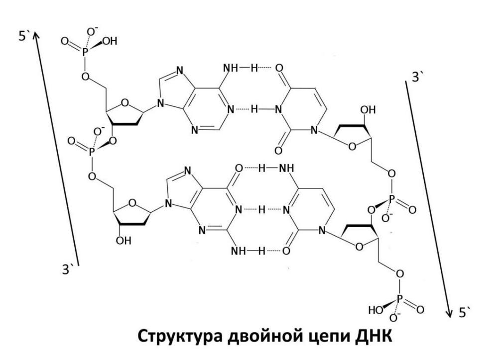 ДНК двуцепочечная нуклеиновая кислота. Откуда берется две цепи? Азотистые основания, находящиеся напротив друг друга, образуют водородные связи. Причем водородные связи образуются по особому правилу, называемому принципом комплементарности.