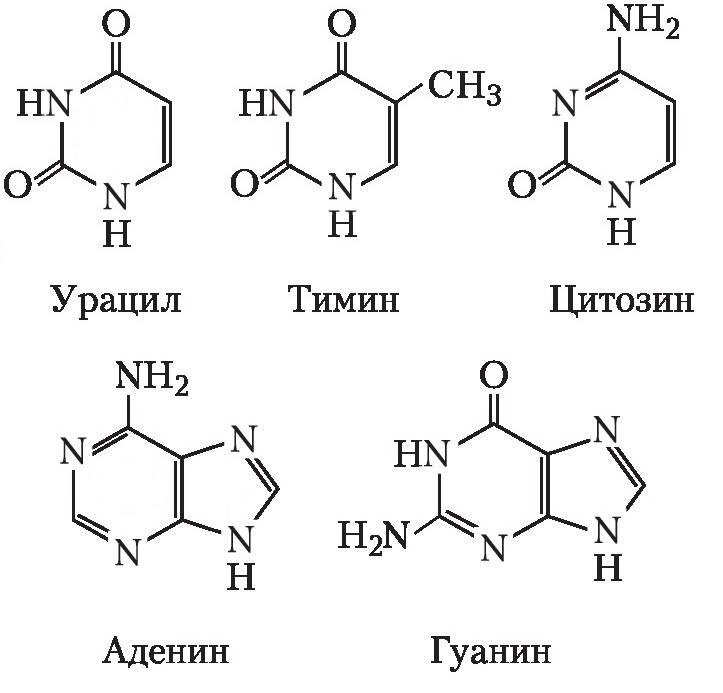 Как мы видим, азотистые основания у ДНК и РНК почти одни и те же, разве что в ДНК тимин, а в РНК урацил. Это придется запомнить.