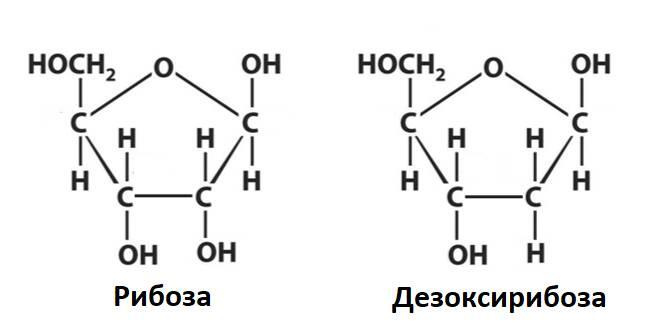 Пентоза это пятиуглеродный моносахарид. В случае РНК это будет рибоза (оттуда и название РНК рибонуклеиновая кислота), в случае ДНК это будет дезоксирибоза (оттуда и название ДНК дезоксирибонуклеиновая кислота). Знать их формулы не нужно, но названия выучить придется.