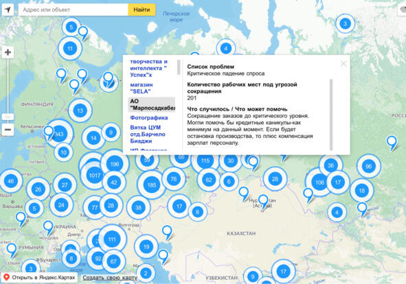 Карта бизнеса, терпящего бедствие из-за коронавирусных ограничений. Если кликнуть по карте, появится анкета для добавления своей организации.