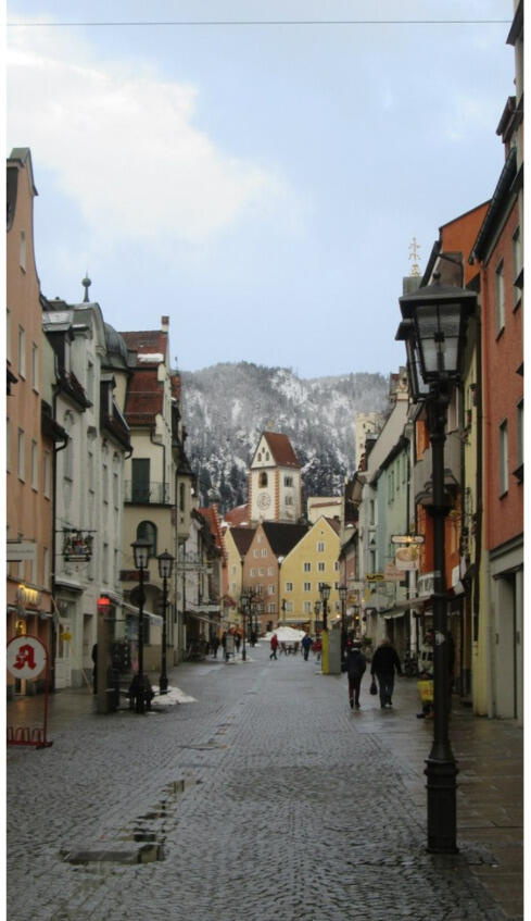 И вот мы уже в Фюссене. Как и предрекал Гисметео, моросит дождь. Все наши последующие дни пребывания здесь, в соответствии с прогнозом, столь же облачны и дождливы. Однако, маленький, милый городок навевал лирическое настроение. Аккуратные разноцветные домики под черепичными крышами, крепостная башня вдалеке, в конце центральной улицы. Всю эту сказочную красоту обступают Альпы, напоминая далёкий родной Кисловодск. Всего десять минут от одного конца города, где находится железнодорожный вокзал, и, пройдя по мосту через реку, мы уже за городом. А ещё через пару поворотов, наша Сказка предстала перед нами во всей своей красе.
