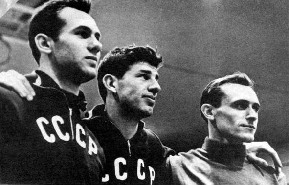 Евгений Момотков (справа) с призёрами Олимпиады-60 Валерием Брумелем и Игорем Тер-Ованесяном © Музей спортивной славы Тульской области