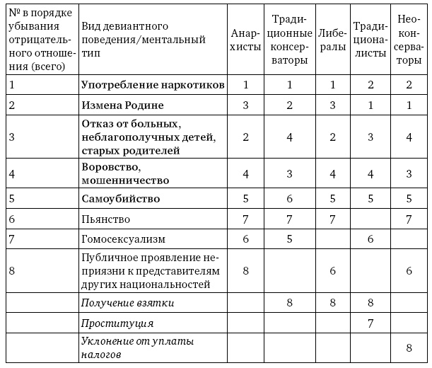 Эти данные, с одной стороны, подтверждают основной вывод авторов, что «ценностное расслоение общества носит достаточно невыраженный характер; все исследованные группы в большей степени исповедуют близкие ценности; большинство факторов их скорее объединяют, чем разъединяют» (Базовые ценности., с. 94). Чем меньше рейтинг, тем больше степень отвержения антиценности. Полужирным шрифтом в таблице выделены те виды девиантного поведения, которые дружно отвергались всеми ментальными типами в начале 2000-х: