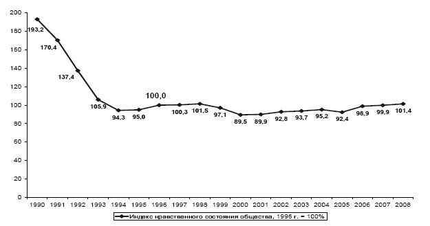 Как видим, динамика негативная со слабо выраженной тенденцией к улучшению в последние годы. Особенно выражено негативное нравственное состояние современного российского общества, если сравнивать его с ситуацией перед реформами в 1990 г., что вынуждает сделать малоутешительный вывод: морально-нравственному состоянию нашего общества реформы на пользу явно не пошли.