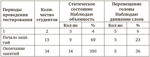 В таблице размещены результаты опросов студентов обучения 20132014 уч. г. По столбцам 34 видно, что с 69 до 100 % увеличивается способности студентов воспринимать статические состояния глубины предъявляемых им тестовых (пилотных) изображений. Особо отметим столбец 5. На принципы «построения» опроса получен патент (Антипов, 2015).