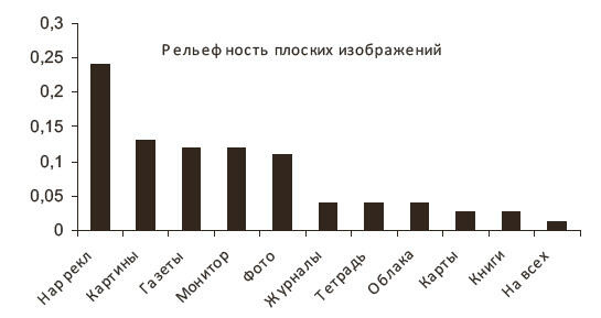 Для одного из тестовых изображений на рисунке 1 приводится диаграмма опросов начала (1) и завершения занятий (3). По диаграмме видно, что за семестр в семь раз возросло количество студентов, определяющих глубину красно-желтого цвета, которой для стереоскопического зрения не должно быть. К завершению занятий около 92 % студентов утверждают, что наблюдают глубину на перечисленных плоскостных изображениях (рисунок 2). Особо отметим, 4 % воспринимают облачный покров в объеме, в одном ответе (или 1,3 %) студент утверждает, что воспринимает объемными любые плоскостные изображения. Впервые о возможности восприятия облачного покрова объемным, написано в патенте (Антипов, 2005).