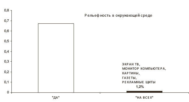 Сравним ответы студентов с опросами, проведенными в средне-образовательных учреждениях. На рисунке 3 построены диаграммы ответов учащихся по восприятию рельефности. Выборка составляла 632 человека. 68,3 % участников опроса утверждают о восприятии рельефности (диаграмма «да»), около 1,2 % воспринимают рельефность на любых плоскостных изображениях. Итого 78 человек утверждают, что все плоскостные изображения воспринимают как трехмерные объекты.
