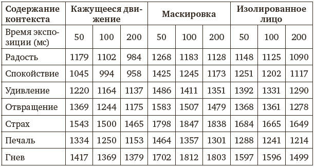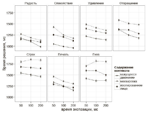 При уменьшении продолжительности экспозиции среднее для всех экспрессий ВР монотонно возрастает (при 200 мс 1308 мс; при 100 мс 1357 мс; при 50 мс 1408 мс). Исключением являются экспрессии страха и гнева, для которых ВР сохраняется неизменным. Продолжительность экспозиции и содержание контекста влияют на ВР независимо друг от друга (взаимодействие факторов оказалось не значимо).
