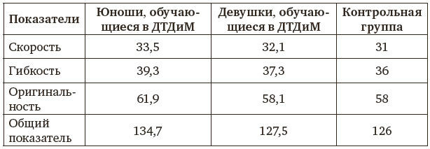 Сравнение данных диагностики обучающихся ДТДиМ и контрольной групп показало, что средние значения показателей вербальной креативности у обучающихся ДТДиМ несколько превышают таковые для детей того же возраста, не занимающихся в ДТДиМ (таблица 1).