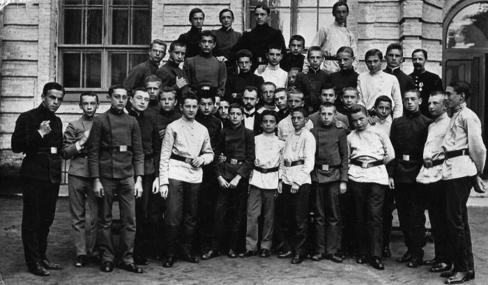 Рис. 2. Ученики гимназии им. Медведниковых, около 1910 г. (Николай Бернштейн третий справа в первом ряду)