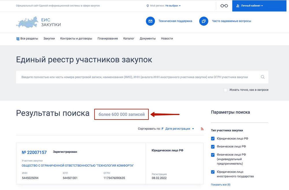 Если мы откроем Единый реестр участников закупок (ЕРУЗ) на официальном Портале закупок, то увидим, что регистрацию прошли более 600 тысяч участников. Это ваши потенциальные клиенты. База ЕРУЗ пополняется ежемесячно, что говорит о возрастающем интересе к тендерам.