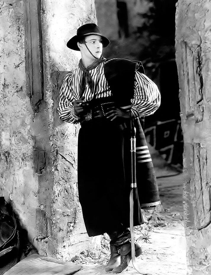 Что касается самого Рудольфа Валентино, то он стал в буквальном смысле первым секс-символом Голливуда. Свое восхождение Валентино начал с преподавания танго, что в итоге сыграло ему на руку, во времена немого кино гораздо важнее было красиво и органично двигаться в кадре, чем играть сложные эмоции. Именно благодаря умению прекрасно танцевать бывший учитель танцев попал в 1921 году в фильм «Четыре всадника Апокалипсиса», где сыграл роль полуиспанца, полуфранцуза в одном из ключевых эпизодов танцующего танго. Популярность картины и танца в одночасье стала так высока, что в танго появилась специальная танцевальная фигура «Валентино», а в моду вошли широкие мужские брюки гаучо, которые носил в фильме главный герой.