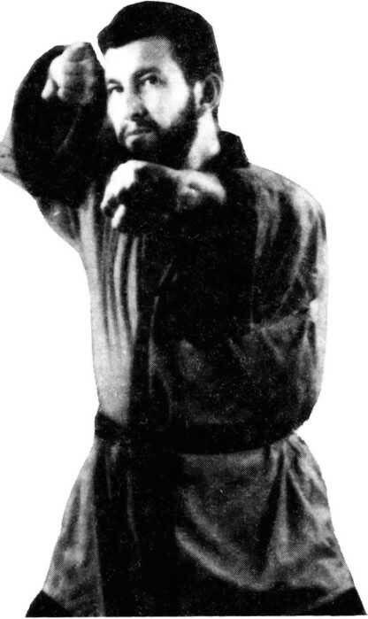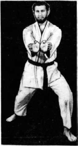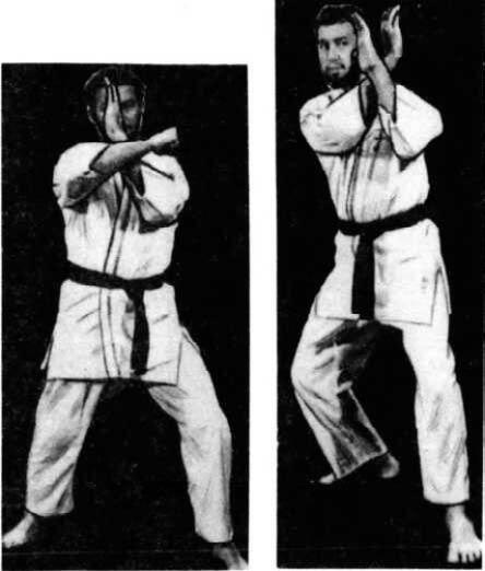 Исходное положение: реверсная рука вытянута вперед; кулак блокирующей руки находится возле уха, большой палец внизу. Защиту против удара, скажем, в солнечное сплетение проводят предплечьем. Кисть при этом может быть сжата в или раскрыта.