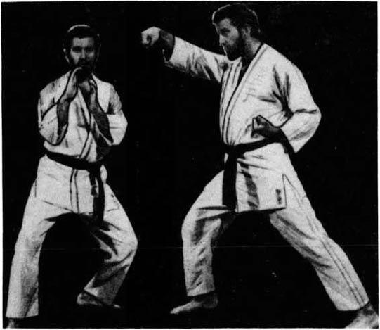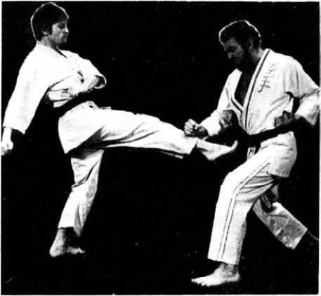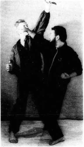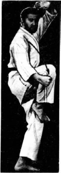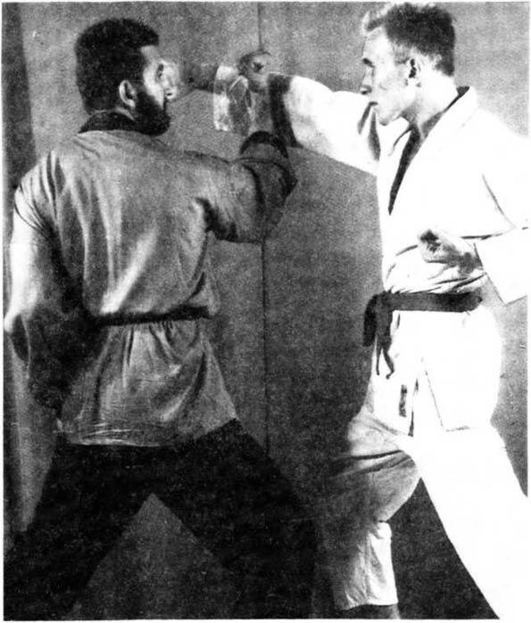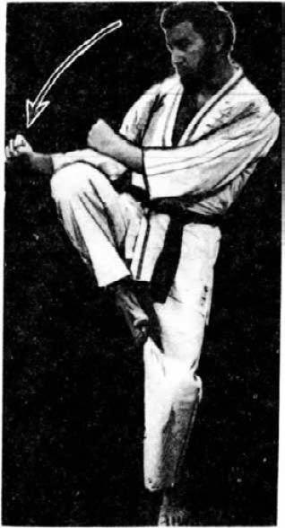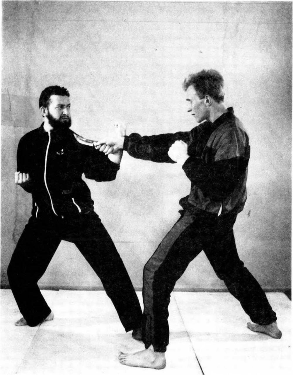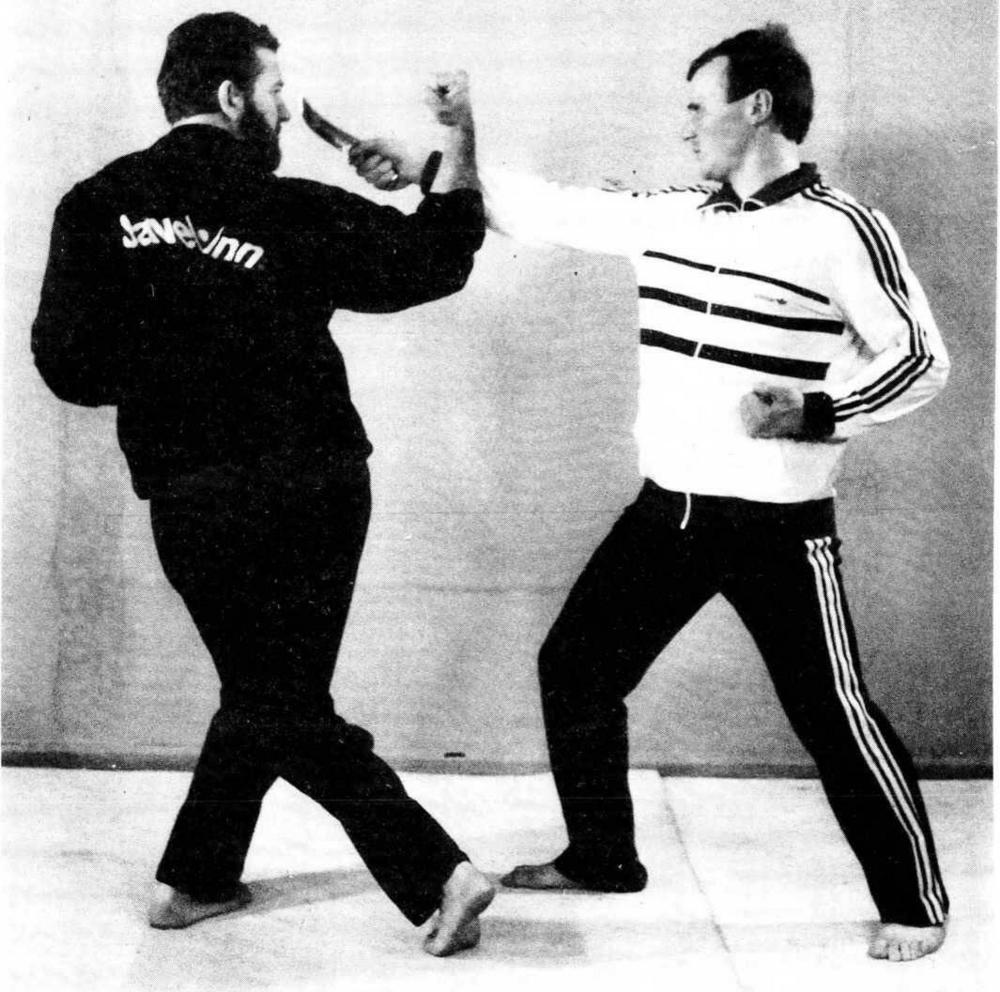 7. Блок основанием кулака с одновременной защитой коленом от удара ногою. Левая рука готова к контратаке.