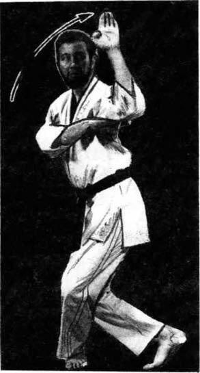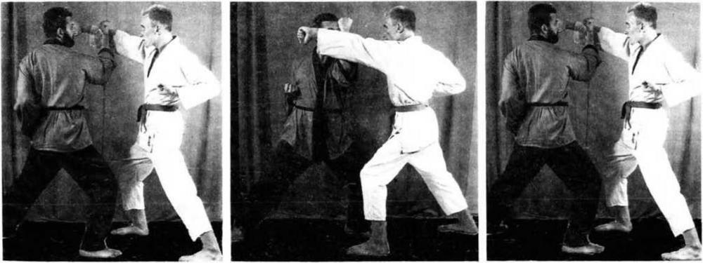 Для этого примите вашу обычную стойку и одновременно с движением левой ступни назад пошлите правый кулак к правому уху. Синхронно вытягивайте вперед левую руку. До окончания шага резко отдерните назад левую руку и проведите блок правым предплечьем снаружи вовнутрь.