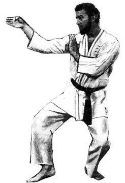Примите правостороннюю переднюю стойку "МИГИ ЗЕНКУТСУ-ДАЧИ". Левая рука вытянута вперед на уровне груди ладонью вниз. Кулак правой руки находится возле правого уха ладонью вперед.