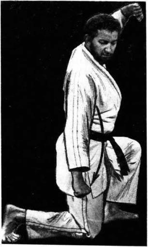 3. Низкий блок типа "гедан-бараи" со стойки "присед" с колена прямо перед собою. Применяется от ударов ногами. Левая кисть готова для проведения контратаки или защиты от удара в голову.