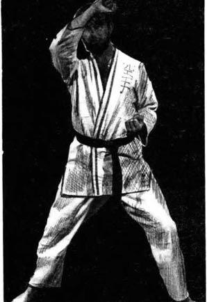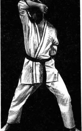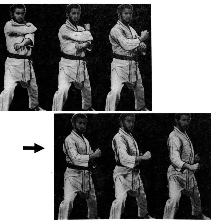 Приняв стойку "КИБА-ДАЧИ, начинайте скользить левой ногой назад в МИГИ "ЗЕНКУТСУ-ДАЧИ". Левая рука при этом выносится вперед ладонью вниз, а правая рука из положения "кулак лежит на левом плече" начинает скользить по ней вперед и вниз, поворачиваясь в предплечье на 90 градусов по часовой стрелке. Реверсная левая рука отдергивается в положение над бедром ладонью вверх.