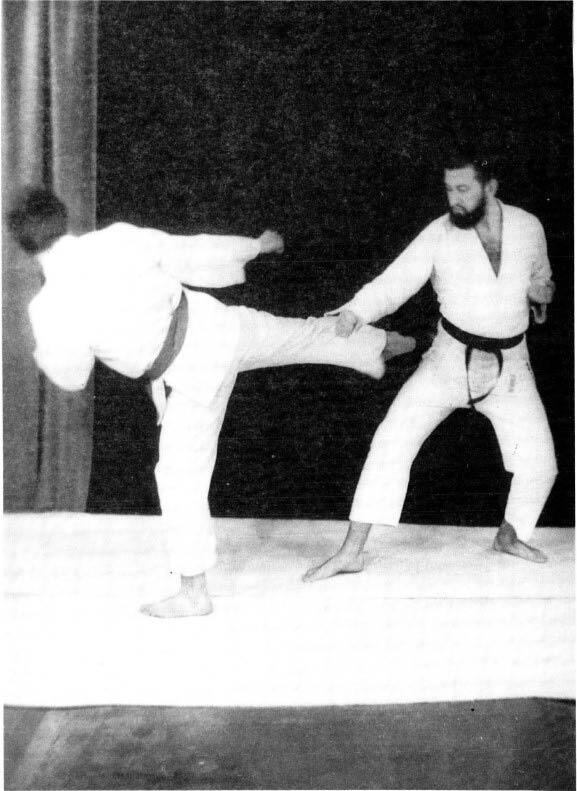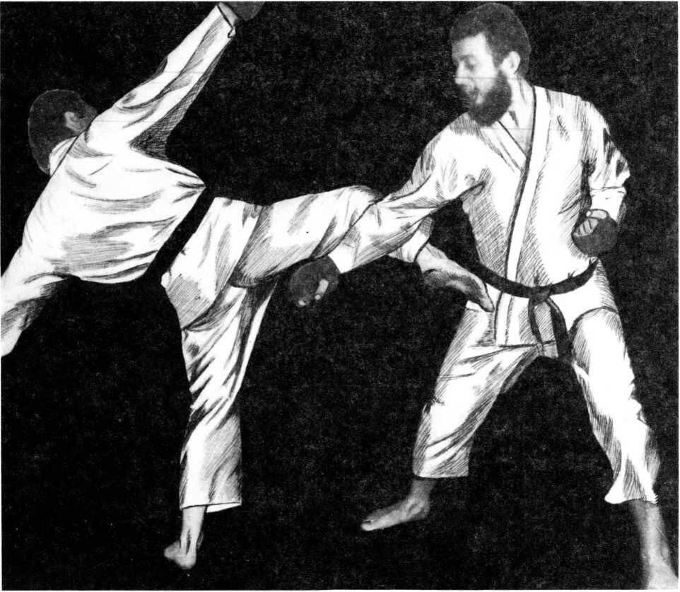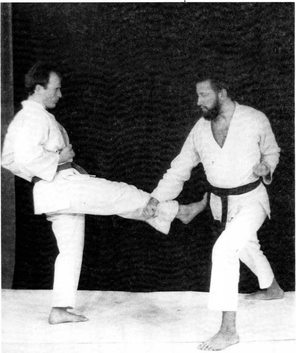 Если противник наносит удар ногой или рукой в область нижнего пояса (ГЕДАН), то вы можете отбить его атаку в сторону за счет сильного движения предплечьем от плеча вниз и немного в сторону.