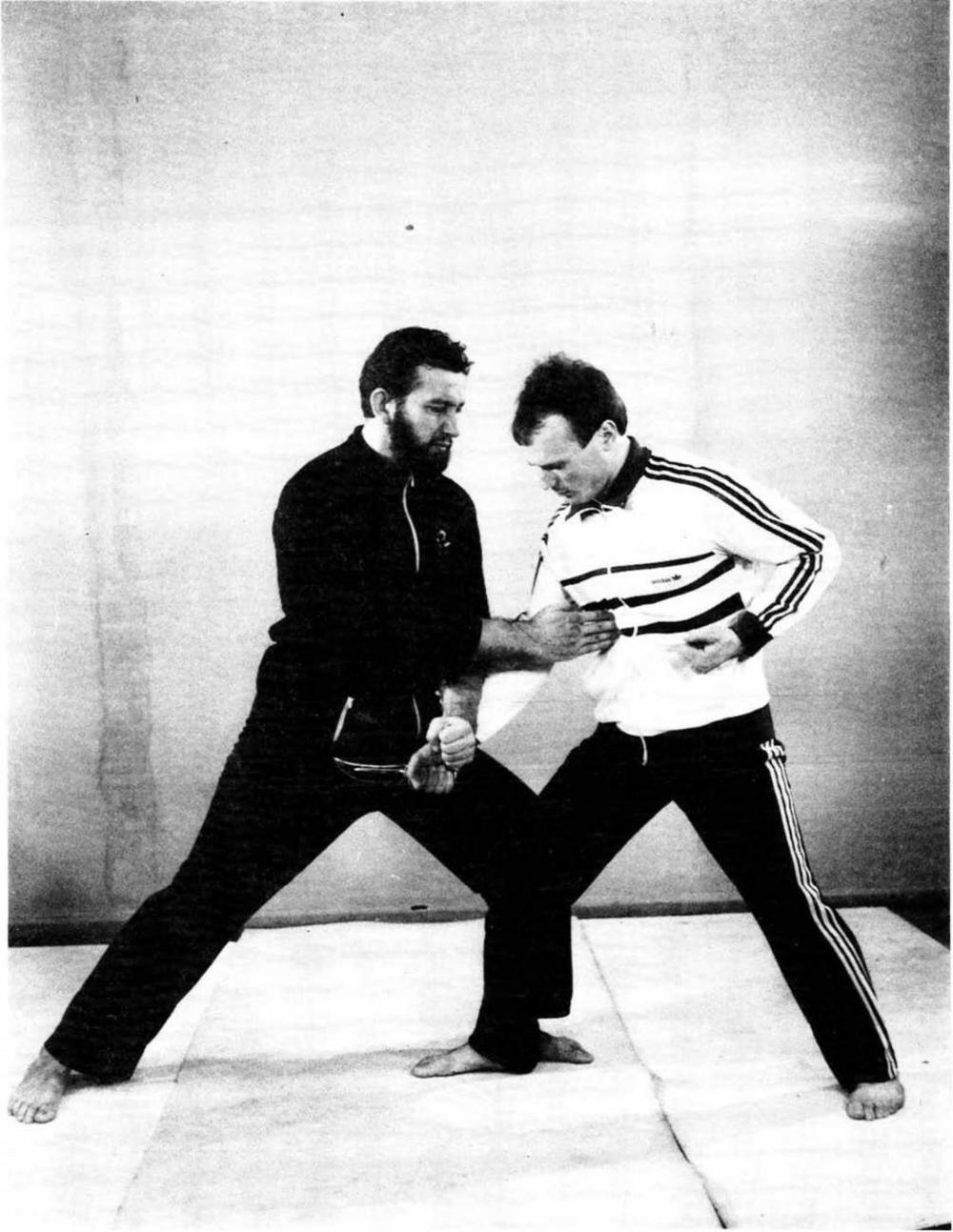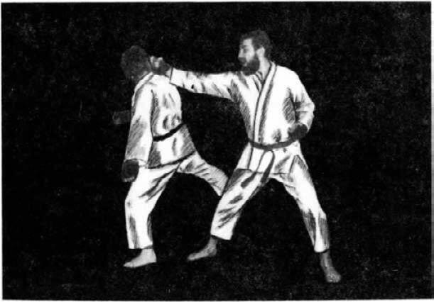 Блокирующая рука движется вниз из положения возле уха к колену одноименной ноги, не выходя за его пределы. Следите за тем, чтобы плечи не были наклонены вперед, а были параллельны полу и стремились попасть в одну плоскость, образованную коленом передней ноги и блокирующей рукою.