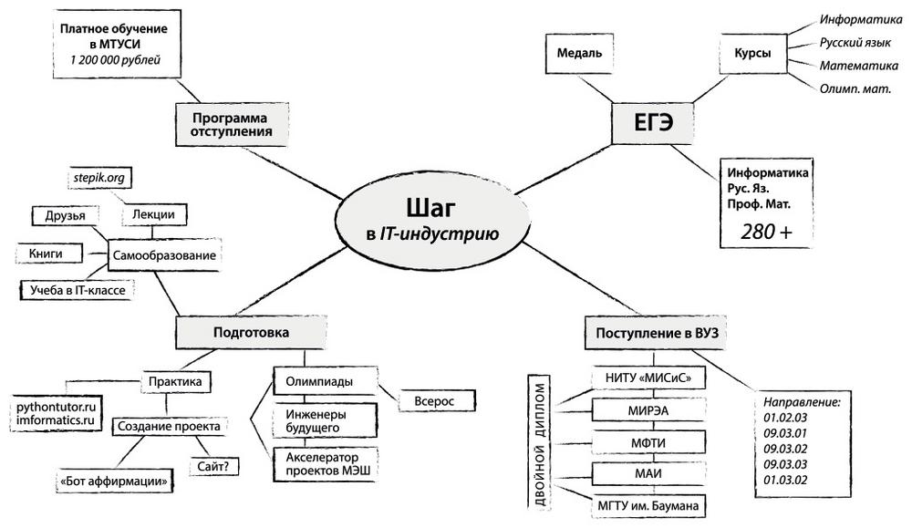 5. В конце окиньте взглядом получившуюся карту и задайте себе вопрос: «Если я сделаю все, что указано на нижних "ветках", поступлю ли я в вуз?» Если ответ будет «нет» дополняйте карту недостающими аспектами и повторяйте это до тех пор, пока ответ не будет «да», ну или хотя бы «скорее всего».
