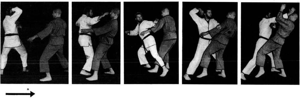 Движением правой кисти по бедру, за ухом и затылком нанесите хлесткий удар "бара-тэ" по диагонали лица противника. При этом ваша правая нога должна стать как можно ближе к его правой ноге. Разворачиваясь "волчком" на 360 градусов через левое плечо, выполните подсечку пяткой левой ноги под ближайшую ногу противника и, захватив левой рукой его руку, нанесите правой рукой удар "сейюрюто-учи" из-за правого уха ему в лицо, висок или по ключице.